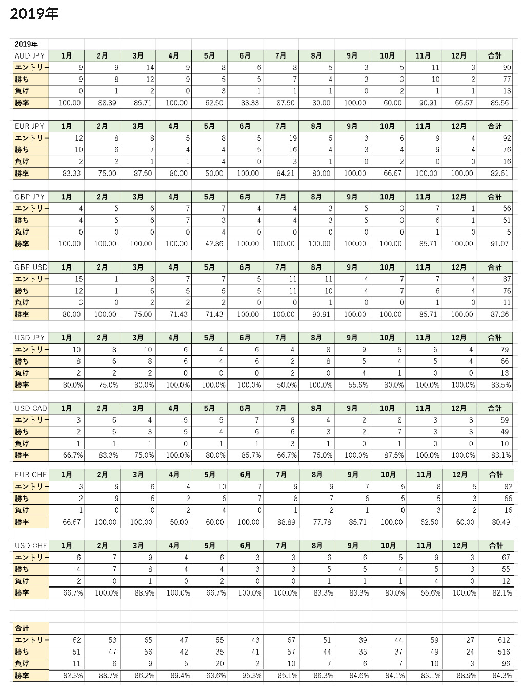 1つの通貨ペアだけではなく、複数の通貨ペアで勝率が安定していなければ「勝ち続けられる手法」とは考えることができないので、主要8通貨で同じ手法を使って過去5年分の勝率を徹底的に検証しました。